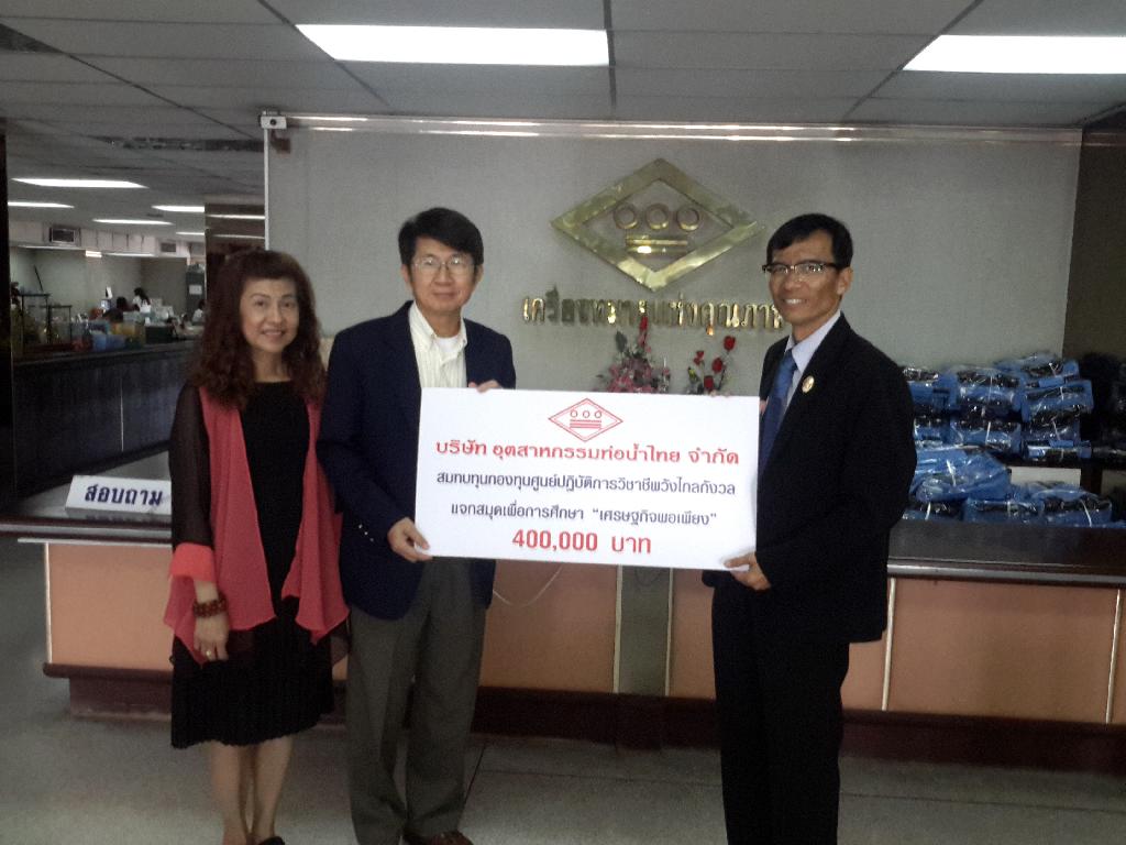 พ.อ.ยรรยง ภัทรเลาหะ กรรมการผู้จัดการ บริษัท อุตสาหกรรมท่อน้ำไทย จำกัด มอบเงินเพื่อสนับสนุนการจัดทำสมุดการศึกษา ชุด "เศรษฐกิจพอเพียง" ฉบับเยาวชน ในโครงการน้ำใจให้น้อง โดยมีคุณจาตุรันต์ วัฒนประทีป ประธานกรรมการมูลนิธิน้อมเกล้าพัฒนา เป็นผู้รับมอบ ณ. สำนักงานใหญ่ บริษัท อุตสาหกรรมท่อน้ำไทย จำกัด