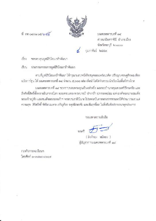 พ.อ.ปรีติ กุมภิรัตน์ หัวหน้ากองกิจการพลเรือน มณฑลทหารบกที่ 14 ได้นำสมุดโครงการน้ำใจให้น้อง มอบให้กับ นายสมิต ธารา ประธานกลุ่มอนุรักษ์ป่าชายเลน ณ ศูนย์การเรียนรู้เชิงอนุรักษ์ป่าชายเลน ตำบลคลองตำหรุ อ.เมือง จ.ชลบุรี จำนวน ๑,๐๐๐ เล่ม เพื่อมอบต่อให้กับเด็กนักเรียนที่จะเข้ารับการฝึกอบรมโครงการพระราชดำริเศรษฐกิจพอเพียง